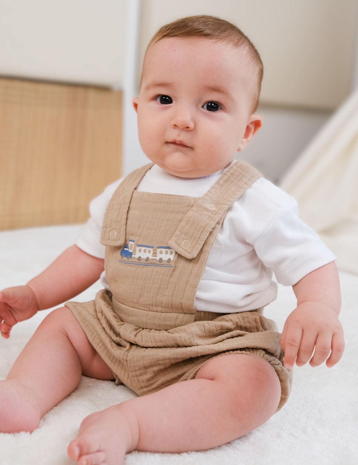 Organic Cotton Muslin Baby Short Dungarees – Beige