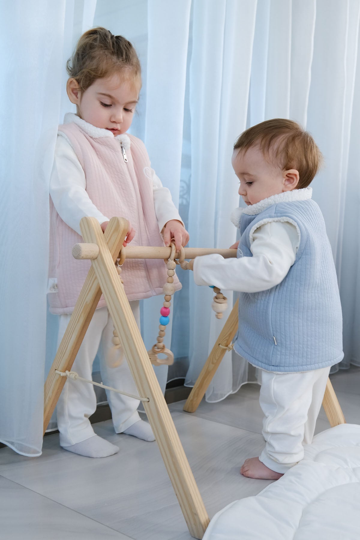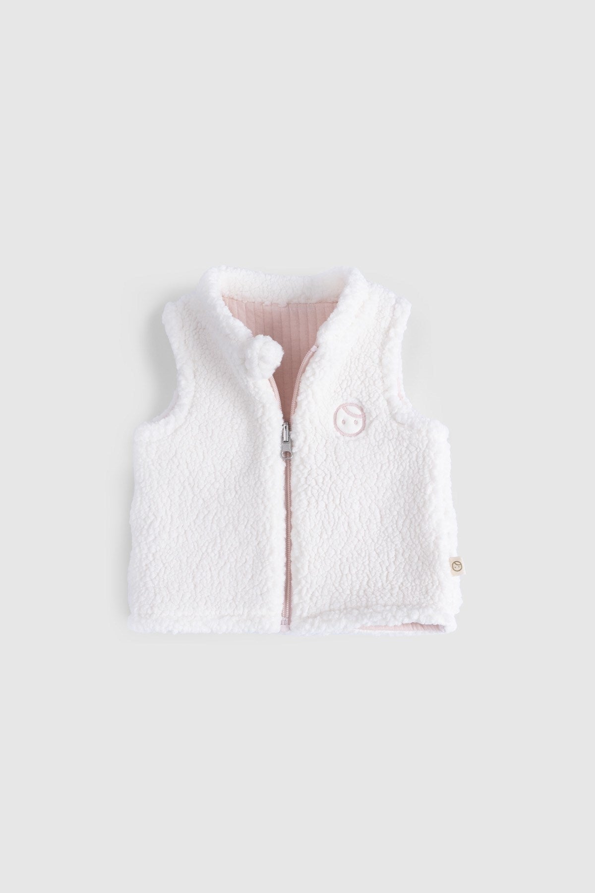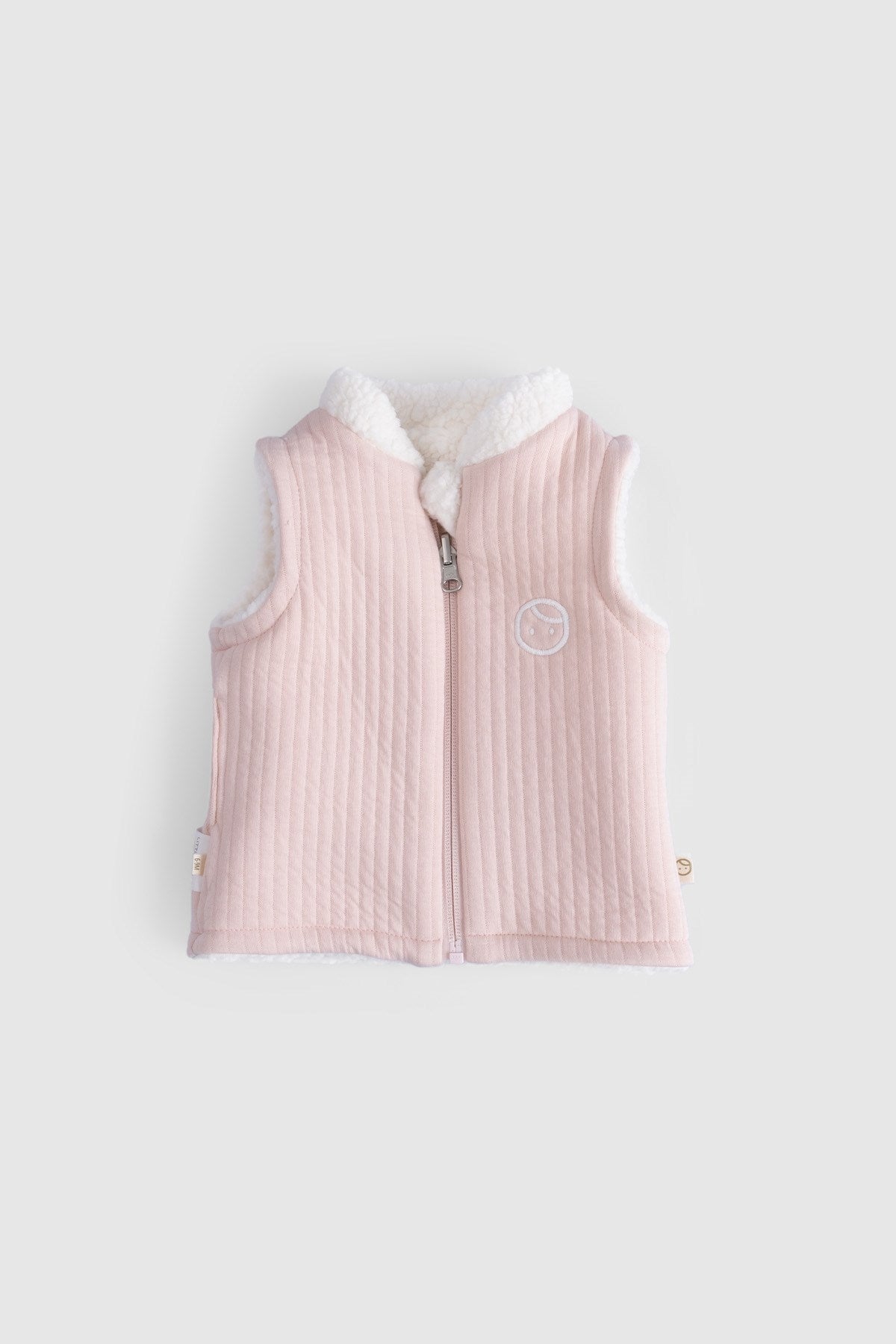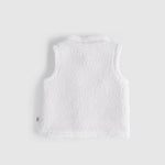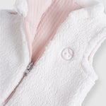This reversible baby gilet features two beautifully soft textures: quilted organic cotton blend on one side and plush sherpa fleece on the other. Perfect for autumn and winter layering while allowing freedom of movement.
