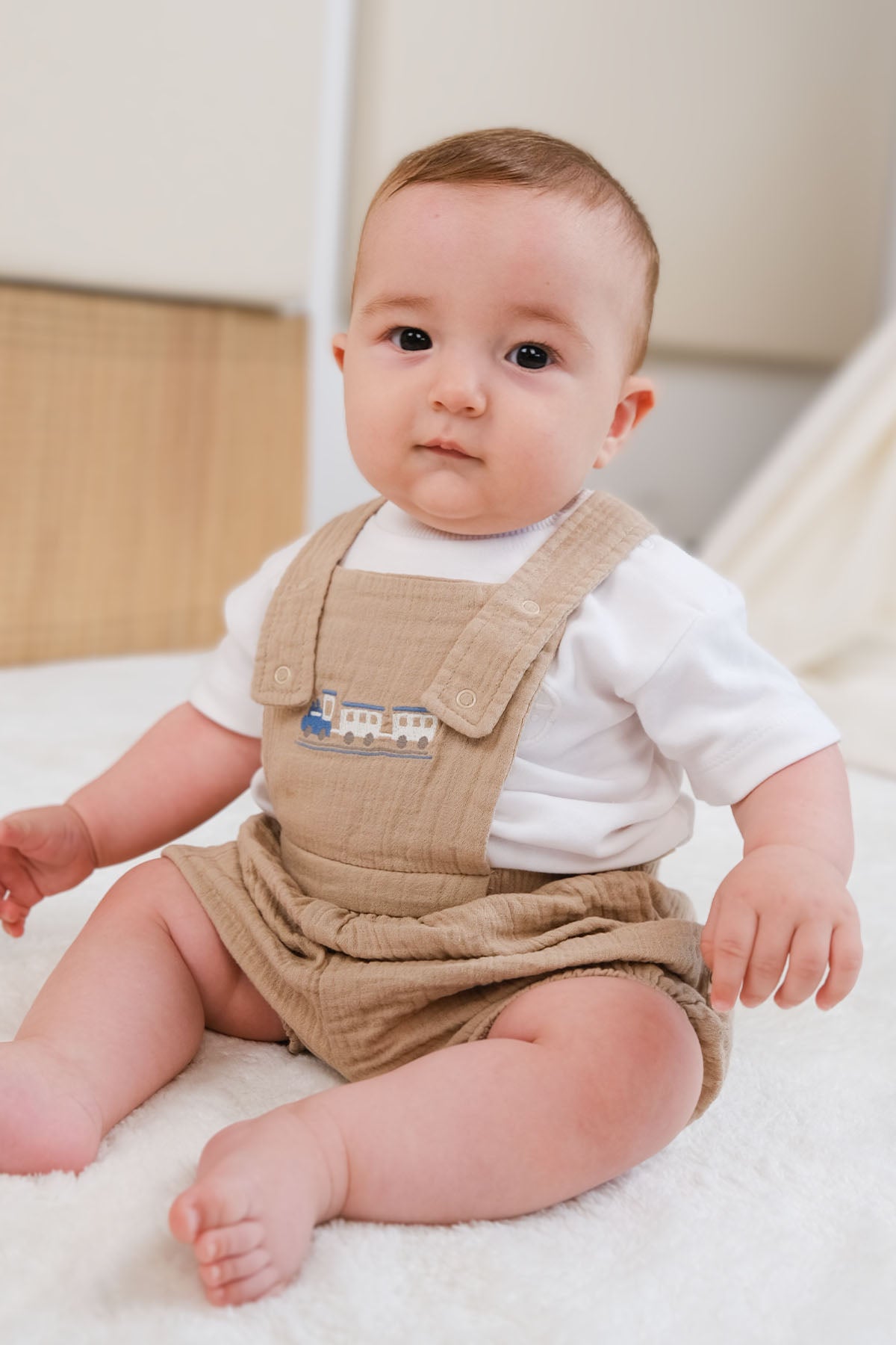 Our beige organic cotton muslin baby bloomer dungarees are crafted from 100% breathable organic muslin cotton, making them soft, lightweight and gentle on delicate skin.