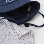Protect your little one from sun and wind with our organic cotton baby bucket hat from the Marine Collection. Designed with an extended snap-on neck flap, this baby sun hat provides extra coverage while remaining lightweight and breathable.